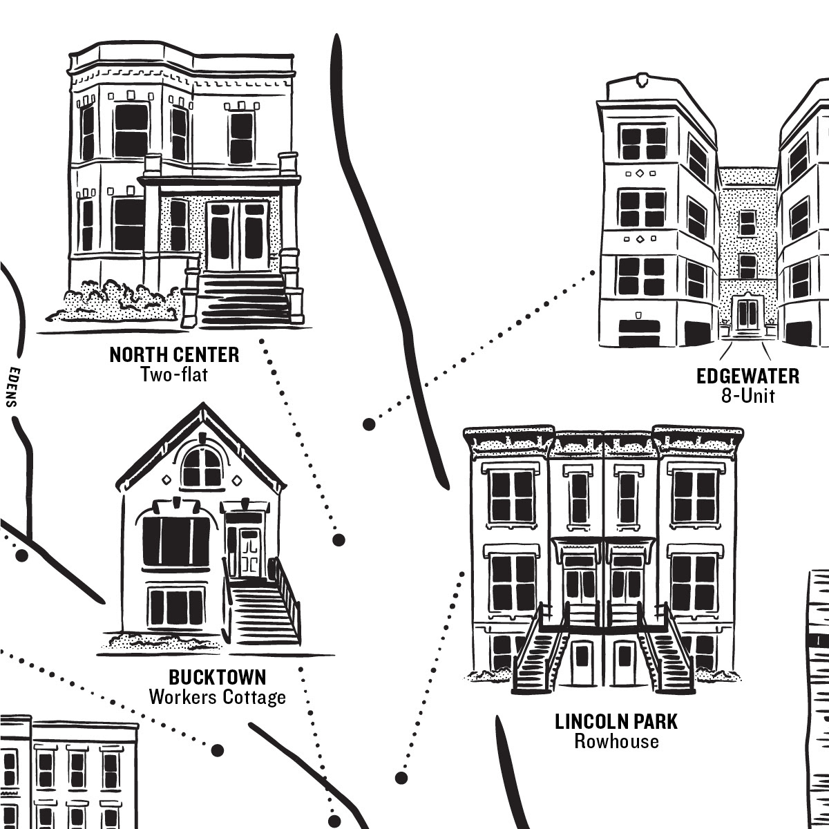 Local real estate firm Redden + McDaniel recently held a networking event and they wanted something unique to give away to the attendees, so they reached out to me to create an illustrated map that highlighted some of Chicago's various residential architecture styles. From bungalows to skyscrapers, two-flats to mansions, greystones to lofts, Chicago has a dizzying amount styles to draw from, but we narrowed it down to 16 different types of residential building styles, spanning all corners of the city.