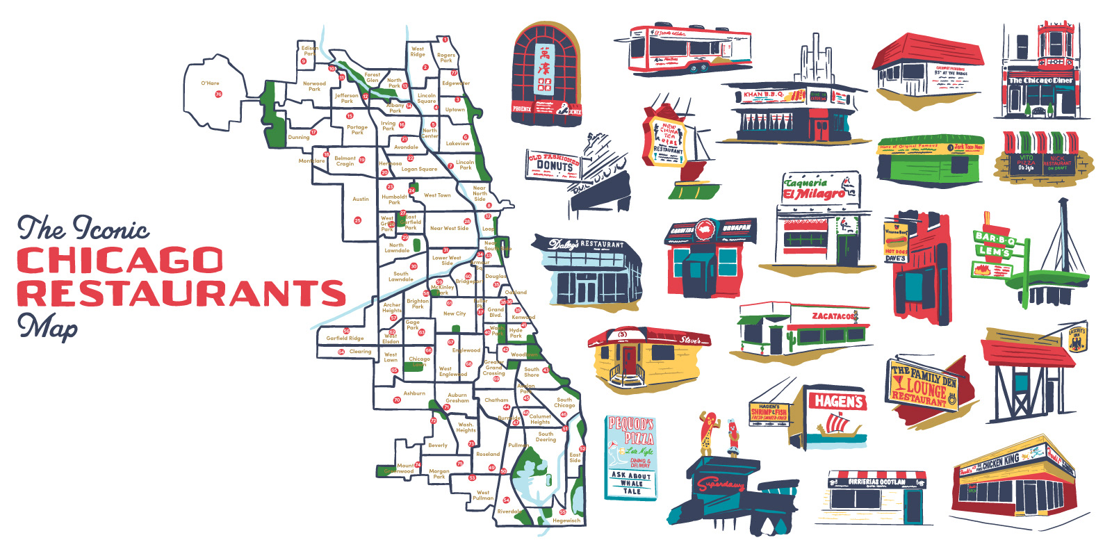 Chicago has a lot of neighborhoods...and a lot of amazing restaurants in those neighborhoods. The Reader set out to create a list of the most iconic independent restaurants in all 77 community areas in the city, and they reached out to me to create an illustration to accompany their story. The Reader is a Chicago institution, and I have always wanted to work with them, so I was pumped when they contacted me about this project.
